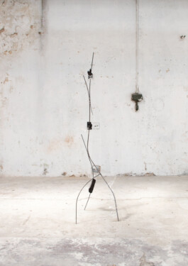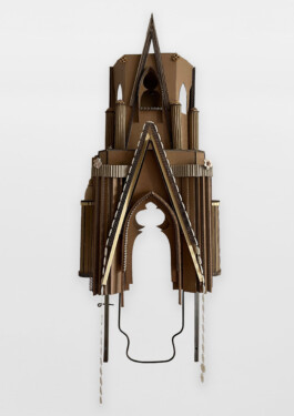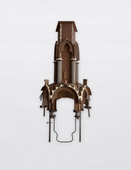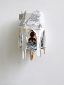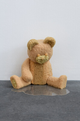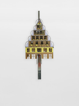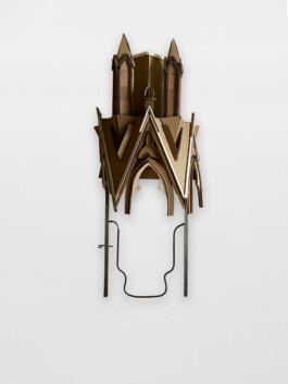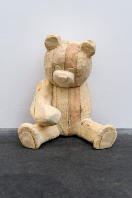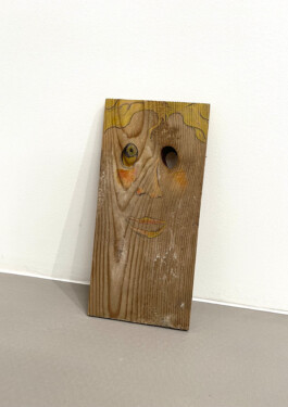 A jumping-jack suspended in mid-air within the theatrical space of a display case. His weak-willed limbs are floating graciously, hands empty, a heart-shaped hinge screwed over his mouth: a dumb puppet, a lovefool, or worse – a people-pleaser? Tobias Koenig’s guileless wooden man conflates the Victorian toy with the silhouette of a minnesinger, evoking a medieval stereotype of love and masculinity. Meanwhile, a dreamscape-like background, rendered in the colour palette of bruised skin, depicts the labour of love and care as a quite different experience. In pitting a raw form of devotion against its culturally rehearsed performances, “Those Irrevocable Words” envisions love beyond power relations... read more