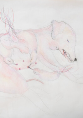A jumping-jack suspended in mid-air within the theatrical space of a display case. His weak-willed limbs are floating graciously, hands empty, a heart-shaped hinge screwed over his mouth: a dumb puppet, a lovefool, or worse – a people-pleaser? Tobias Koenig’s guileless wooden man conflates the Victorian toy with the silhouette of a minnesinger, evoking a medieval stereotype of love and masculinity. Meanwhile, a dreamscape-like background, rendered in the colour palette of bruised skin, depicts the labour of love and care as a quite different experience. In pitting a raw form of devotion against its culturally rehearsed performances, “Those Irrevocable Words” envisions love beyond power relations... read more